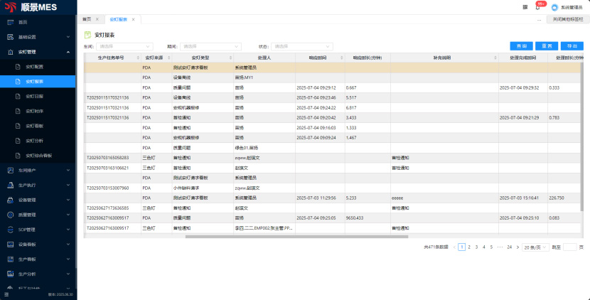 支持按日期范圍查詢車間安燈事件詳情0包括類型分類、響應時效及處理進度。