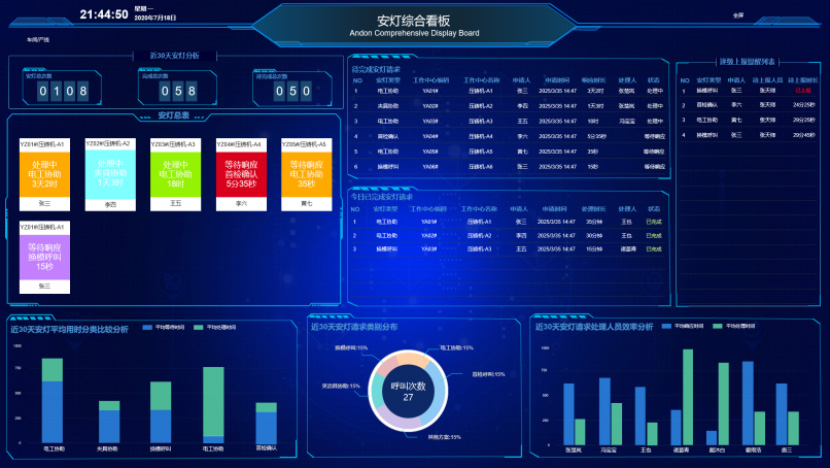 可視化看板提供多維度的安燈數桐分析0包括П近30天安燈事件趨勢分析、安燈平均處理時長統計、安燈類型分布占比、處理人員響應效率評估口以及實時展示當日安燈狀態與已完成事項明細