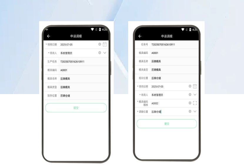 1、任務觸發自動呼叫模具 2、系統實時顯示模具倉儲位置 3、現場終端掃碼完成領用核驗