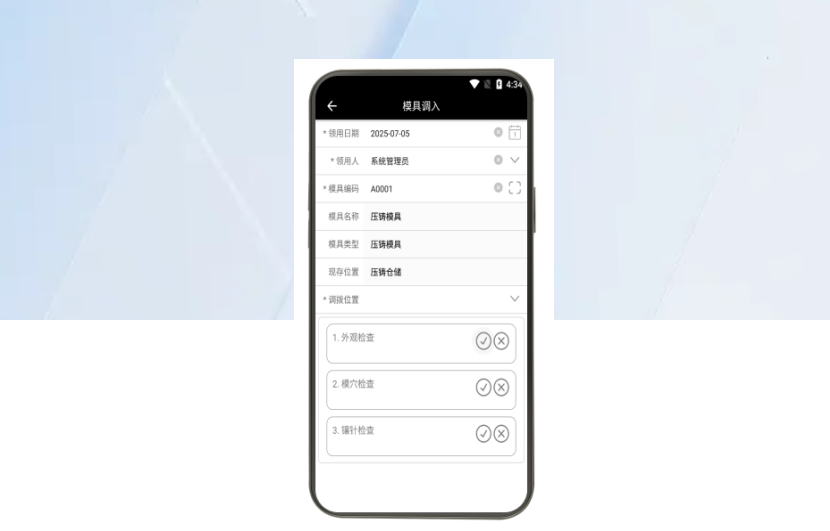 模具歸還至倉庫時,可根據不同類型設定相應的檢查項目,并通過終端設備完成檢查流程
