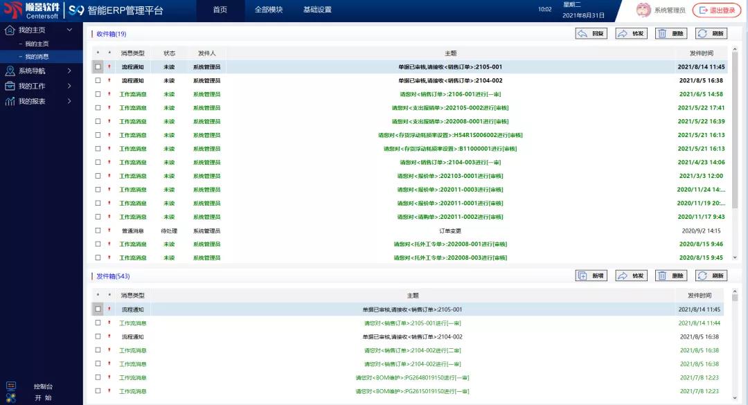 發(fā)件箱:可新增ERP內(nèi)部郵件選擇收件人發(fā)送,系統(tǒng)內(nèi)觸發(fā)所需要簽核的流程單據(jù)