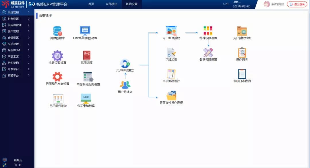 「基礎(chǔ)設(shè)置」分為:《系統(tǒng)管理》、《財(cái)務(wù)設(shè)定》、《供應(yīng)商管理》、《客戶管理》、《倉儲(chǔ)設(shè)置》、《品質(zhì)設(shè)定》、《存貨BOM》、《產(chǎn)品工藝》、《組織架構(gòu)》、《開發(fā)平臺(tái)》、《預(yù)警平臺(tái)》模塊
