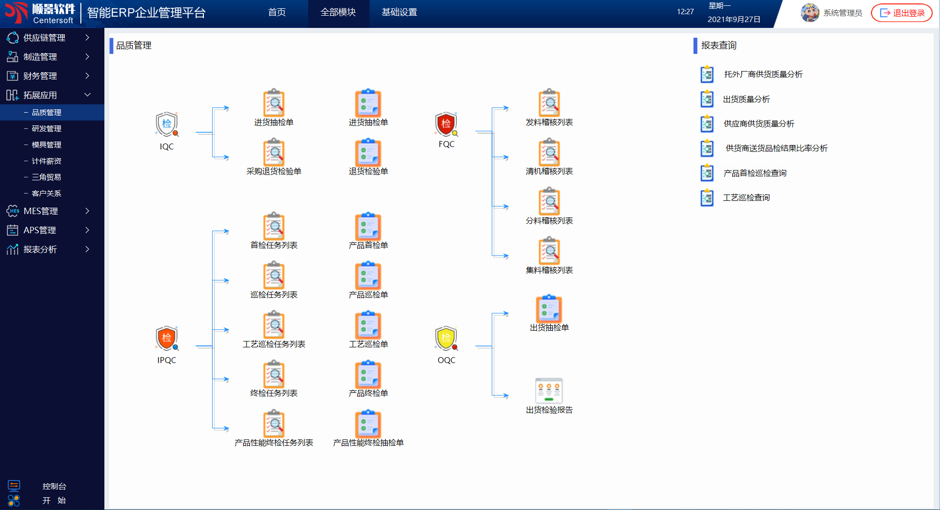品質(zhì)及生產(chǎn)過程監(jiān)控,是順景S9 ERP另一管控重點(diǎn);IQC來料檢驗(yàn),會由系統(tǒng)生成質(zhì)檢工令單進(jìn)行材料檢驗(yàn),材料從倉庫到配料房到攪拌、擠出的每一過程及位置移動,IPQC都會有稽核任務(wù)并回報(bào)稽核結(jié)果是否有異常,生產(chǎn)首檢、巡檢、工藝巡檢、產(chǎn)品性能終檢都在系統(tǒng)中進(jìn)行記錄和監(jiān)控,出貨后也有出貨檢驗(yàn)報(bào)告生成。