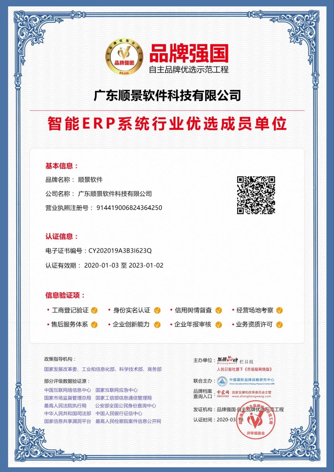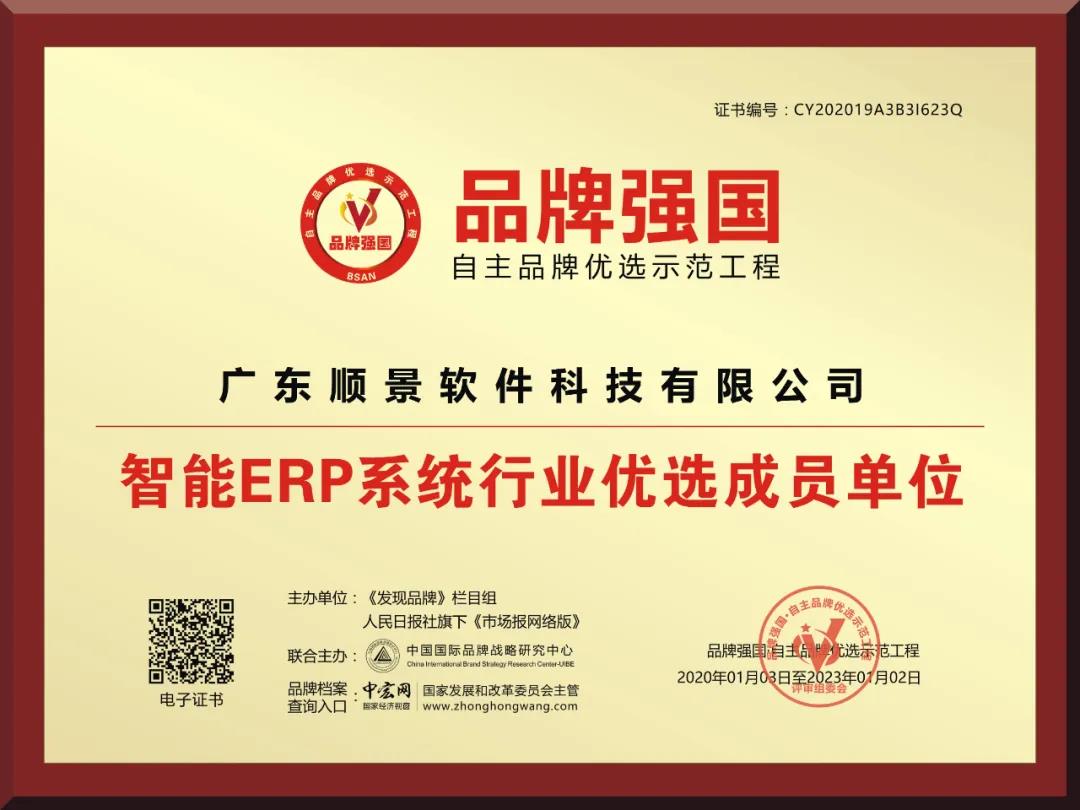 經由品牌強國示范工程東莞地區運營中心審核、認證、社會公示,“順景軟件”符合示范工程評選標準,成功入選為品牌強國示范工程智能ERP系統行業優選成員單位,企業信息錄入品牌強國示范工程數據庫,在國家級平臺展示品牌形象。