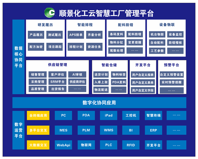 本次順景參展產品是新一代化工云,順景化工云智慧工廠管理平臺對化工新材料工廠普遍存在的配方保密、研發履歷、計劃排程、配料防錯、自動配料、品質追溯等關鍵工藝環節提供完美管控和專業服務,大幅提升應用效果。于研發技術人員而言,可真正幫助解放雙手和大腦,減少無效和重復性勞動,簡化溝通流程,規避常規型錯誤,做到研發全流程數據科學存儲歸檔,實現可追溯、可對比、可總結、可加密、可恢復、自動優化配方、單向傳輸數據等,與生產管理無縫銜接。于整個工廠而言,最終實現質量可追溯、設備可感知、過程可管控、錯誤可避免、數據可分析、經驗可學習,幫助企業實現提質、降本、增效。